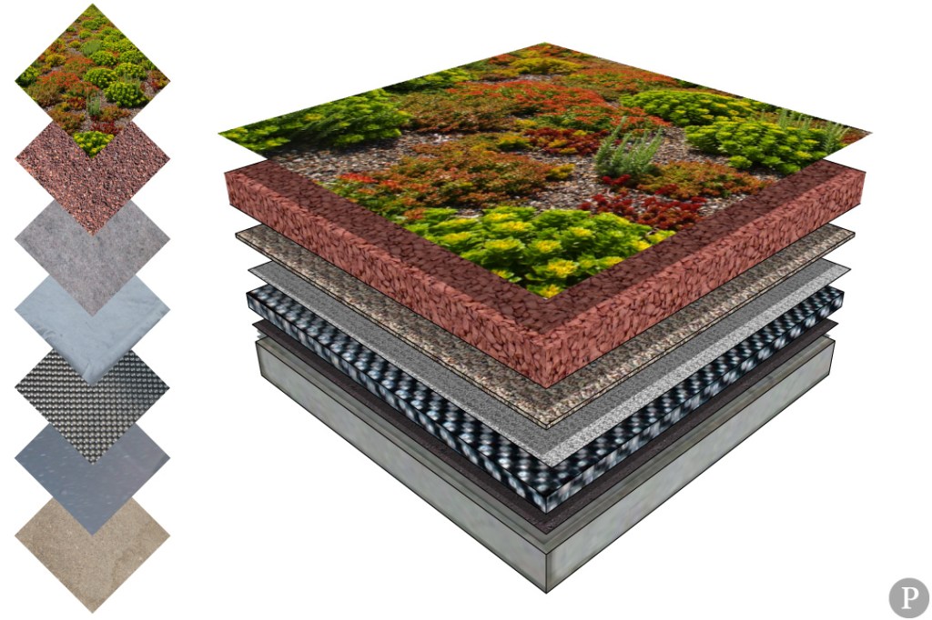 [From the bottom] Roof slab, protective fleece, EDPM, drainage cell, geotextile, rooting felt, substrate and planting layer.